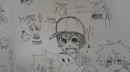 そこにはコマンド入力してる社長やら、全速前進DA☆と言ってる社長やら、ずっと俺のターン!な遊戯、そして骸などなど、いろんなキャラが居たんですけど………そんな中、とある落書きを発見してテンションが上がりました。